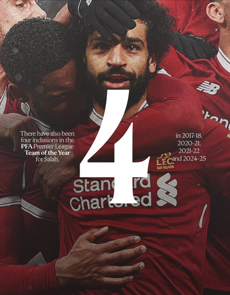 个人荣誉簿上,萨拉赫的名字熠熠生辉。4次英超金靴,与亨利并列历史最多;3次PFA年度最佳球员,历史首人;4次入选PFA年度最佳阵容;3次当选FWA年度最佳球员;7次当选英超月最佳,与阿圭罗、凯恩并列最多。