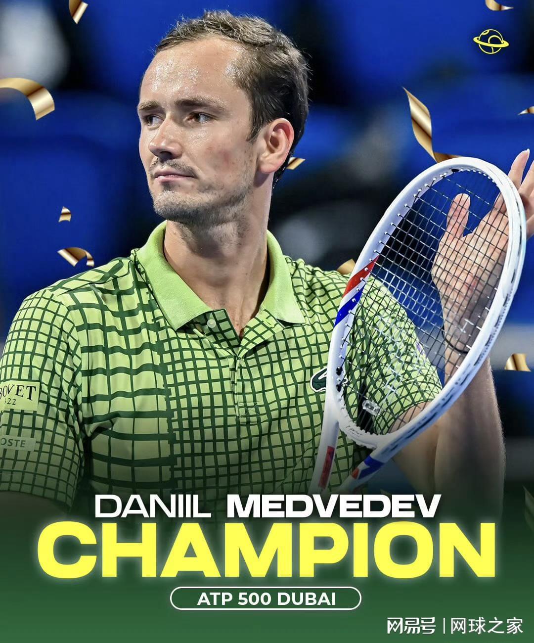 2月28日这一天,梅德韦杰夫以一种极为特殊的方式赢得了个人第23个ATP单打冠军——由于荷兰选手格里克斯普尔在赛前因腿筋受伤退赛,俄罗斯人甚至没上场就捧起了迪拜站的冠军奖杯。